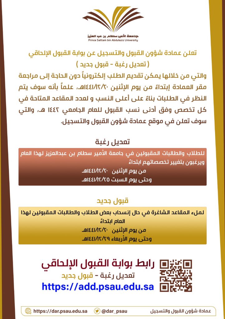 عمادة القبول والتسجيل On Twitter إعلان فتح بوابة القبول الإلحاقي