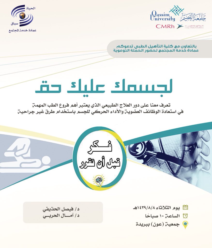 عمادة خدمة المجتمع Twitterissa يسر عمادة خدمة المجتمع بالتعاون مع كلية التأهيل الطبي دعوتكم لحضور الحملة التوعوية لجسمك عليك حق في مقر جمعية عون ببريدة يوم الثلاثاء 1439 8 8هـ Https T Co Siry7lmw6o